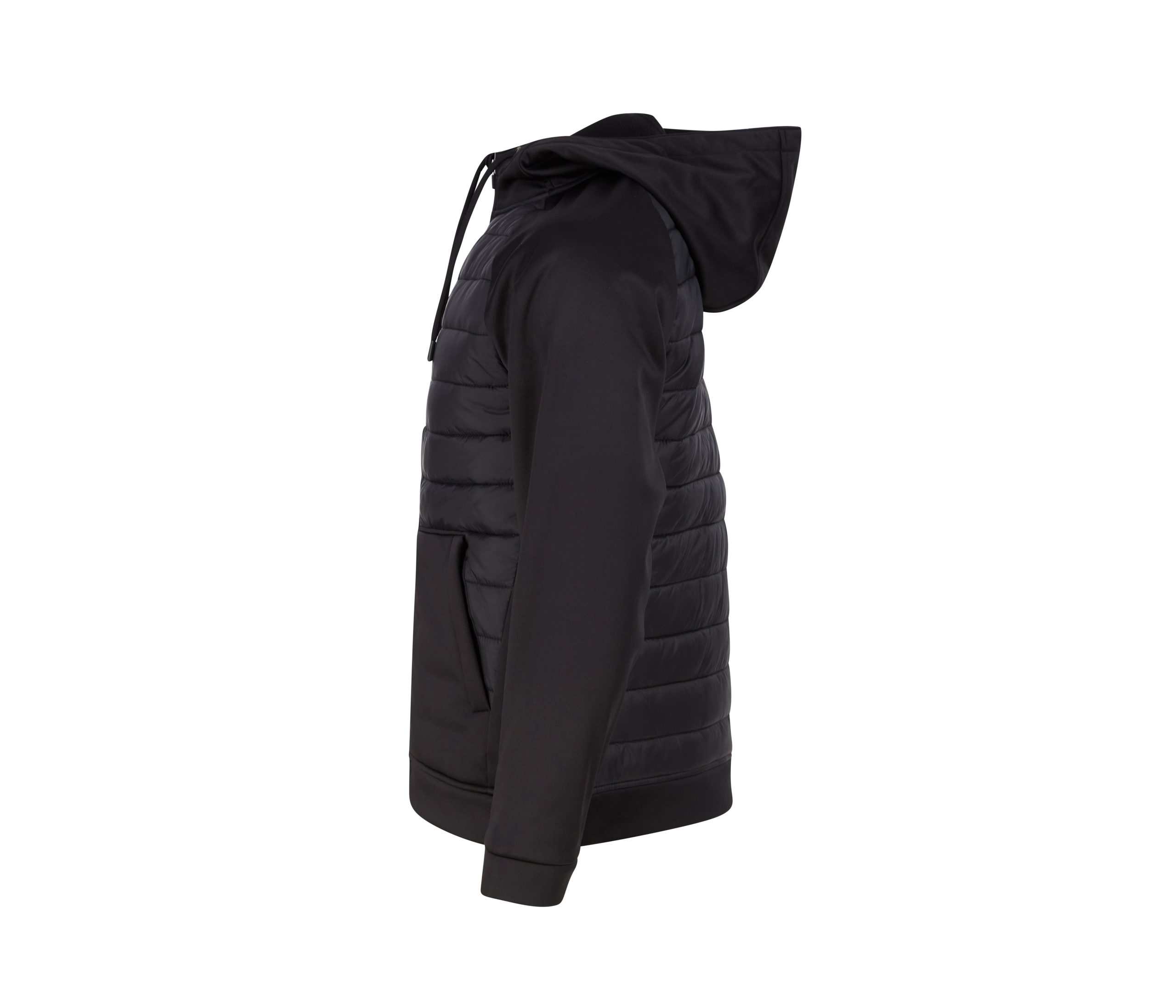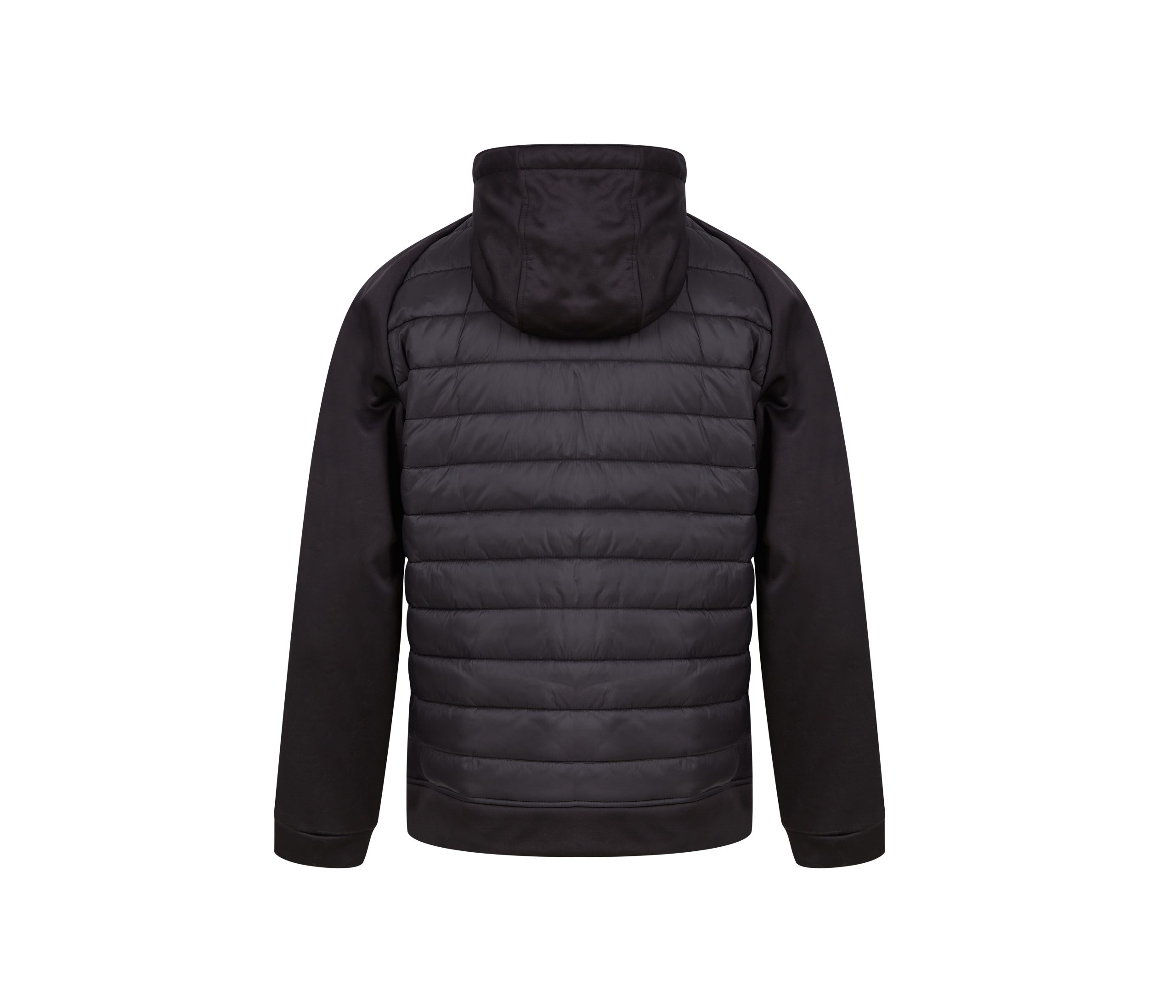 Veste unisexe. Softshell sur les manches, la poche kangourou et la capuche. Corps matelassé.