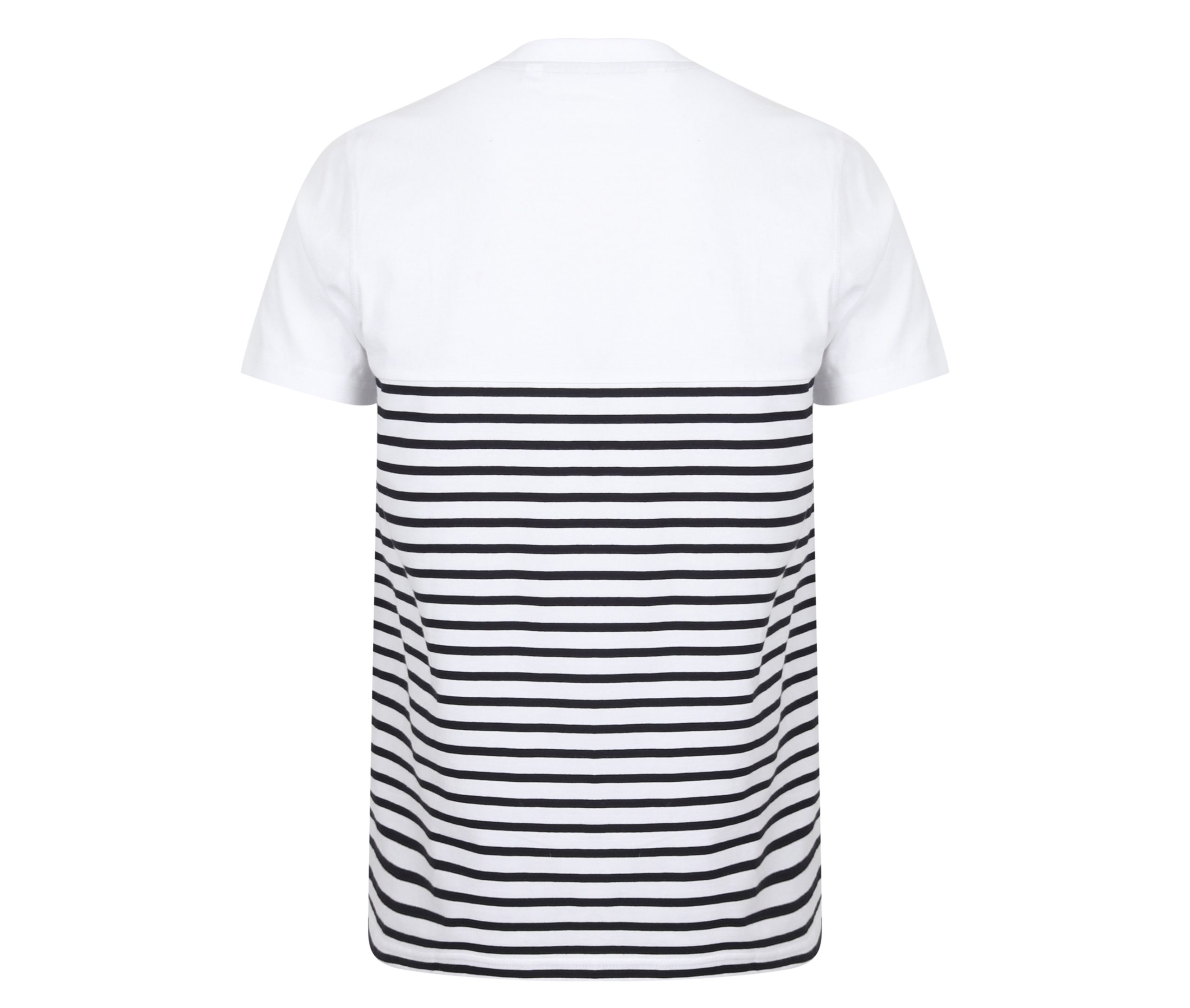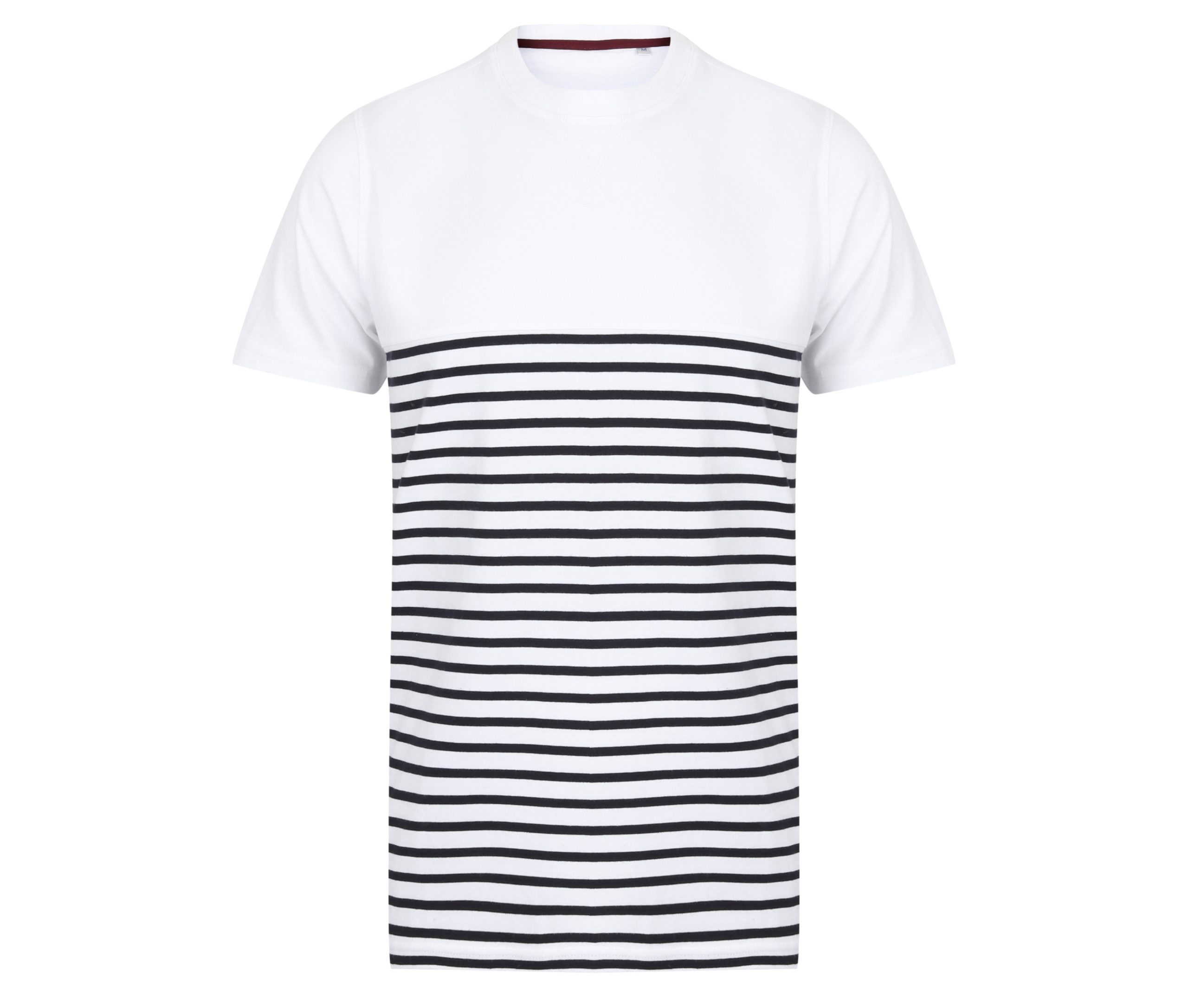 Marinière manches courtes, coupe droite. Sans étiquette. Col rond en bord côte stretch. Double sûrpiqûre manches et bas. Coutures en V au col. Manches longues Réf. FR134.