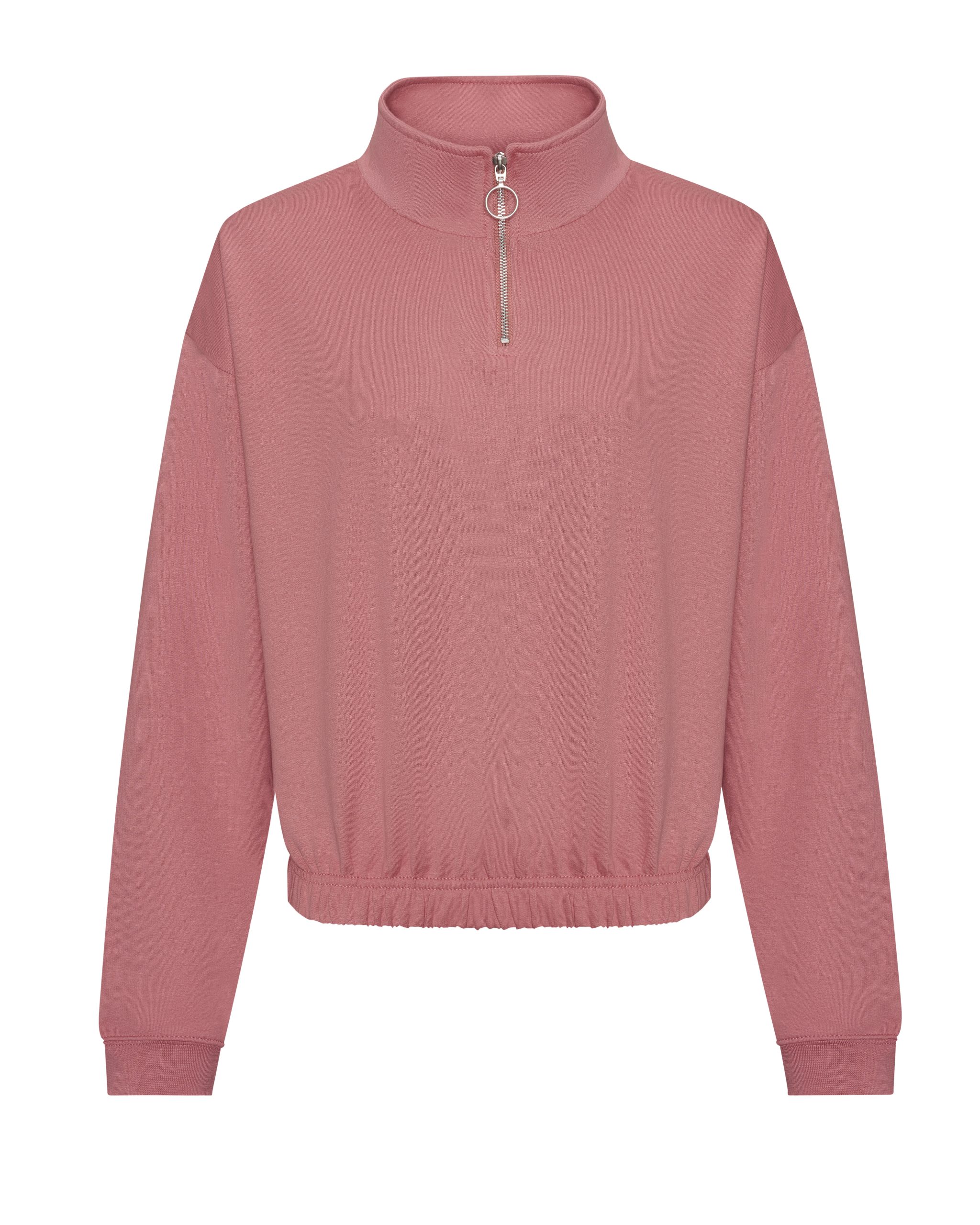 Coupe féminine classique. Col cheminée (1/4 zip). Intérieur brossé. Taille élastiquée. Poignets en bords côte. Étiquette détachable.